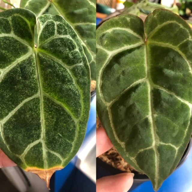 Check the substrate. This plant originally came in a mix of about 80% soil and 20% perlite. For the Crystal, this mix stays too wet for too long in an indoor environment. It loves to air out quickly. Now that it’s in an equal mix of sphagnum moss, coco chips and soil, it’s finally settled. The new leaf has emerged much more vibrant with its signature velvet coating. Have a look at the before / after photo to see the difference. The old mix resulted in new leaves dying before rising, and the ones that did unfurl took a very long time to turn velvety and dark. Even then, the velvet is spotty and the leaf is kinda sad. With the new substrate, it unfurled and turned dark in a few days.